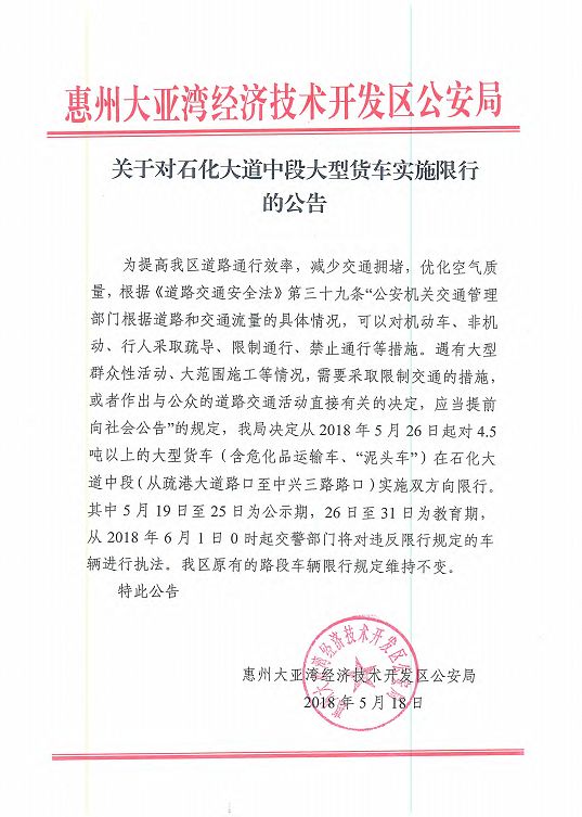 關于對石化大道中段大型貨車實施限行的公告