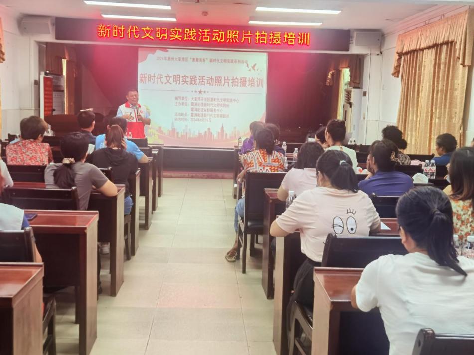 有多年新聞攝影經驗、惠州志愿者風采攝影比賽獲獎者郭竹松跟大家一起分享“攝影的基本構圖、手機常用的拍攝功能”等手機攝影基礎知識點,并對標新時代文明實踐活動照片拍攝要求,學習《人民日報》刊登的《大雨中的堅守》《溫暖上學路》《“虎頭帽”迎虎年》等優秀作品中的取景、構圖和意境,同時,精選霞涌新時代文明實踐志愿服務隊志愿者在霞涌“媽祖誕”和“楊包廟會”民俗活動中拍攝的優秀照片進行點評。
