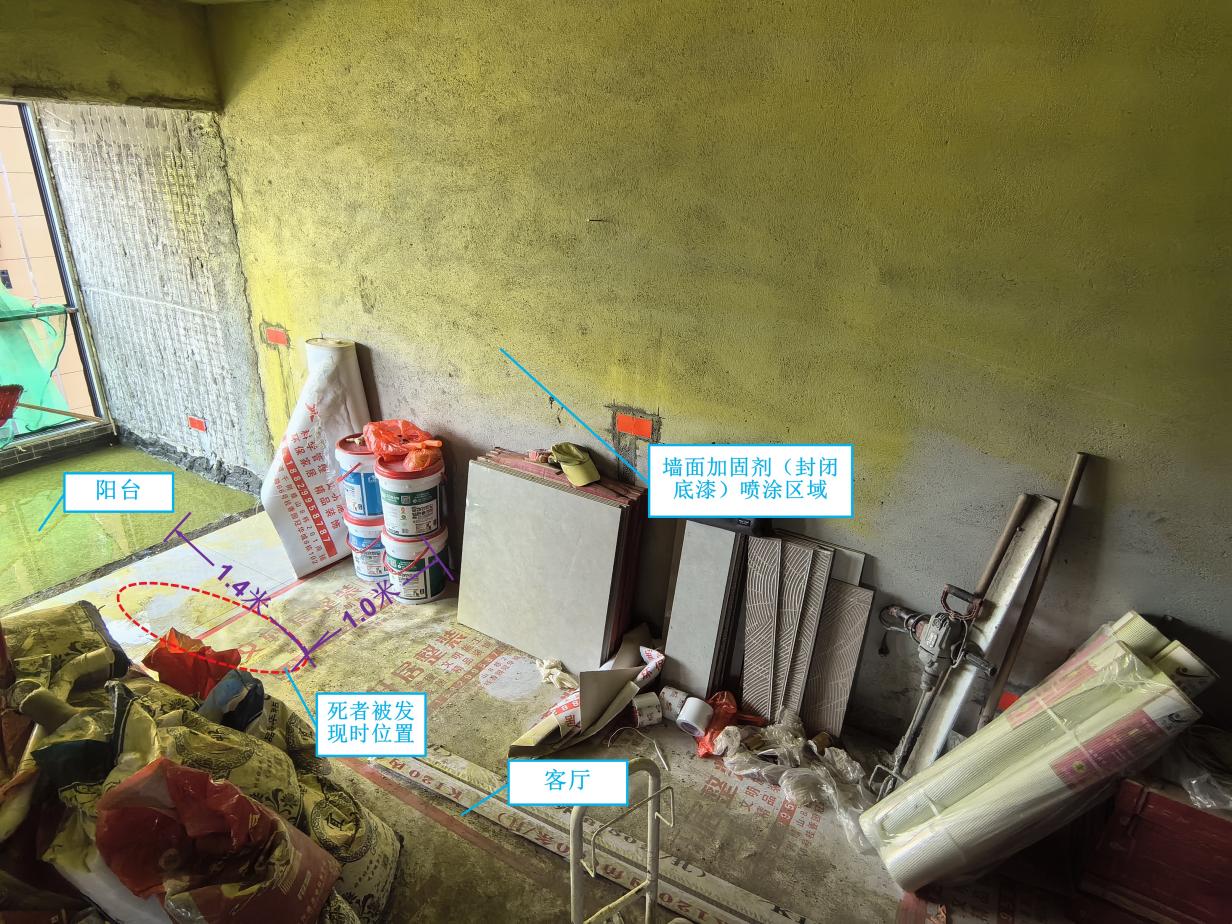 當事人李*被發現時,其仰臥躺在客廳西南角側、靠近陽臺,頭部大致朝北、腳朝南,頭部距離西側墻邊約1.0米、距離南側陽臺邊約1.4米,手握噴涂機的噴槍。見附圖2、附圖3。