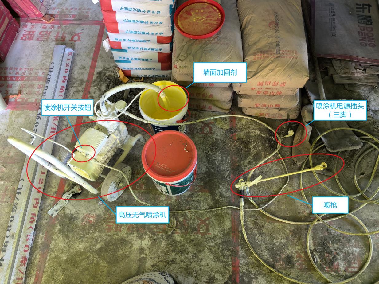 4.當事人李*作業環境為房間客廳內,作業時站立在地面,使用噴涂機對墻面進行噴涂,除觸電隱患外,無其他易發事故隱患。