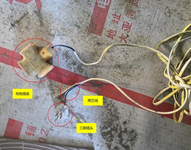 當事人使用的電源為兩芯電纜線+地拖插座,插頭端用三腳插、只接兩芯線,無接地PE線,與噴涂機的三腳插頭不配套;該線從入戶電源開關插座盒接入后延伸至噴涂機旁邊,線長約11.0米。見附圖4。