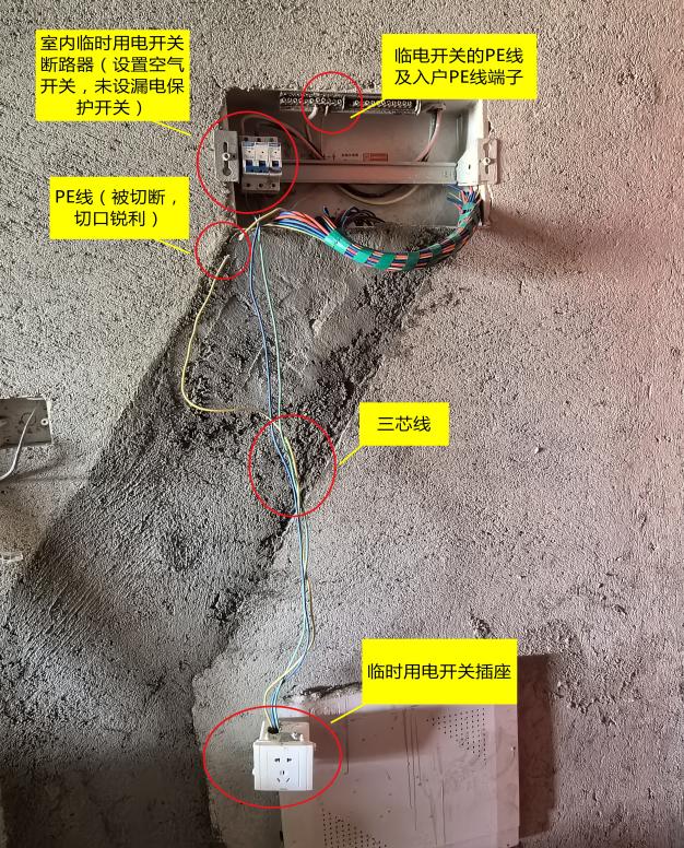 入戶電源為一相一零一地線,設置了PE線端子,設置了空氣開關作為斷路器,未設漏電保護器。從斷路器、PE線接線端引出的一相一零一地線,通過簡易的三根電線連接到旁邊的臨時開關插座盒,從PE線端子至插座盒的PE線處于斷裂狀態。見附圖5。