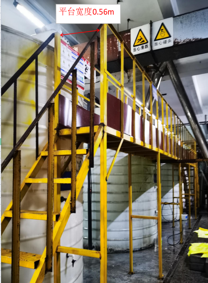 尿素混合系統(tǒng)區(qū)域鐵質操作平臺,平臺高2.06m,平臺上兩側設置有高0.94m的護欄,護欄內凈寬度0.56m。操作平臺在東西兩側各設置一個樓梯(見圖5)。