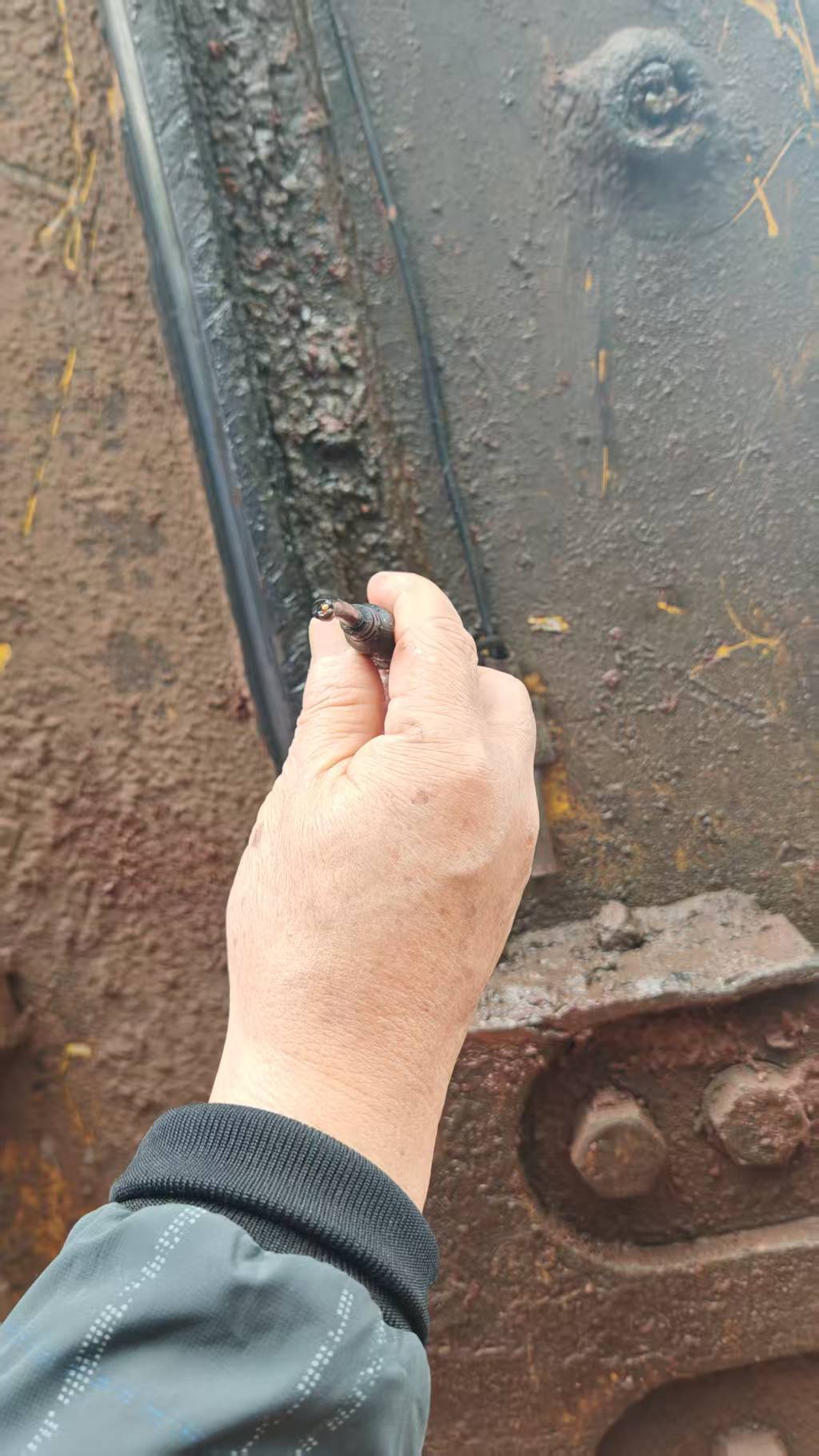 經(jīng)現(xiàn)場(chǎng)檢查,發(fā)現(xiàn)位于挖掘機(jī)動(dòng)臂上的、離地面約2~2.4米的位置,有液壓管與液壓缸的接頭。在該接頭處,有新安裝上的凹頭螺絲(現(xiàn)場(chǎng)發(fā)現(xiàn)該螺絲光亮如新),及不同直徑的兩個(gè)螺帽(詳見(jiàn)圖5、圖6)。