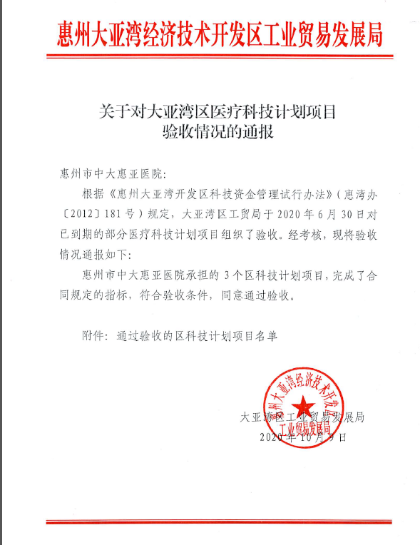 關于對大亞灣區醫療科技計劃項目驗收情況的通報