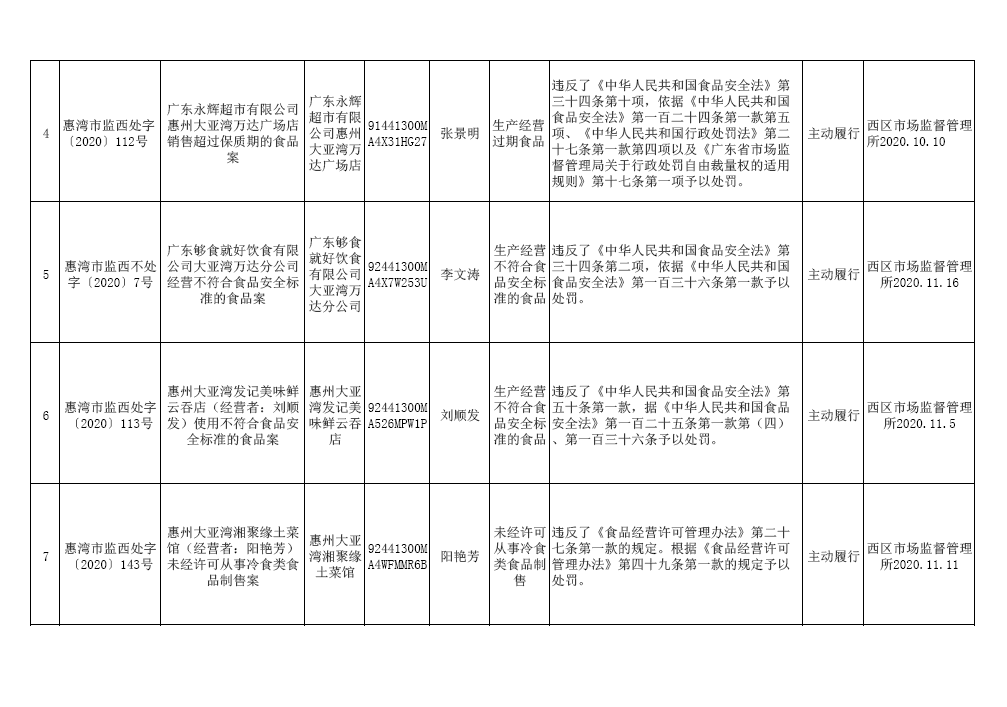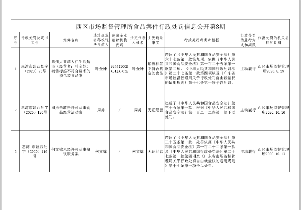 大亞灣區市場監管局西區所食品案件行政處罰信息公開第8期