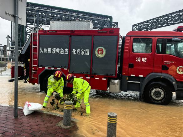 大亞灣區森林消防大隊和國家危險化學品應急救援惠州隊在內澇點清理雜物并開展排水作業