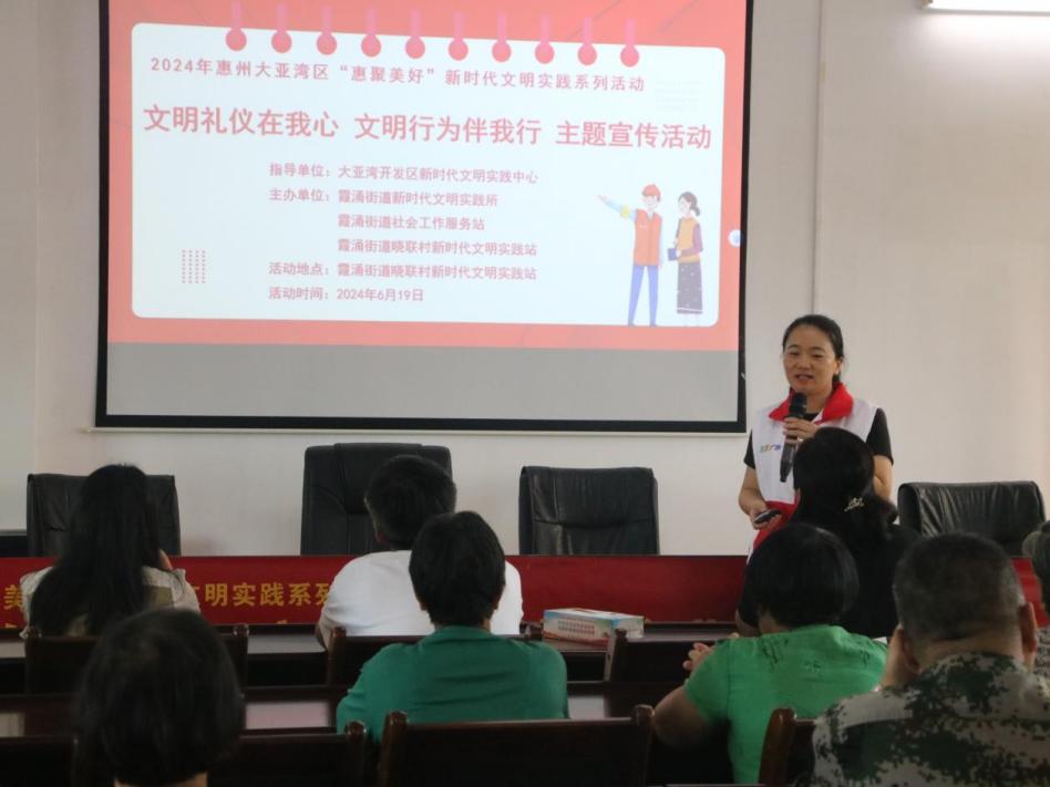 同一天,在霞涌街道曉聯(lián)村新時代文明實踐站,小伙伴公益宣講團志愿者講師符蘭芳,通過現(xiàn)場授課和觀點問答、分享的形式,將日常生活常見的禮儀常識、溝通表達、穿著禮儀、公共場合文明行為等多方面進行理論分享和情景演示,現(xiàn)場互動性十足,學(xué)習(xí)氛圍濃烈。