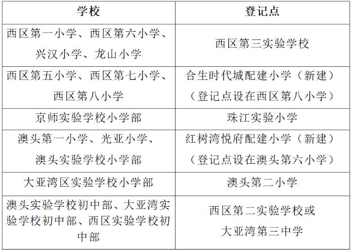 西區第一小學、西區第六小學、興漢小學、龍山小學、西區第五小學、西區第七小學、西區第八小學、京師實驗學校小學部、澳頭第一小學、光亞小學、澳頭實驗學校小學部和初中部、大亞灣區實驗學校小學部和初中部、西區實驗學校初中部等13所學校。屆時,學校根據空余學位數,按學區內的第一批積分由高到低依次錄取,錄滿為止。不能被以上13所學校錄取的第一批戶籍插班生,則統籌調劑到大學區內或街道內其他公辦學校,不服從調劑的按放棄轉學處理。