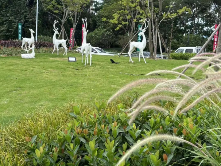 在大亞灣大道牧馬湖小區門口,成片綠油油的草坪上站著幾只輕盈靈動的“白鹿”,優雅別致的景觀裝飾點綴其中,讓道路環境更顯詩意。紫花風鈴、變葉木、露兜草、亮葉朱蕉、馬尼拉草等植物作為這條景觀廊道的底色,充滿了無限生機。藍雪花、狼尾草等地被植物旺盛生長,形成了一道長達五六百米的絢麗風景線。項目負責人介紹:“這片區域還加裝了裝飾燈,正式亮燈后,夜晚這些植物將顯得更加迷人,就像一條被繁星點綴的夢幻之路。”