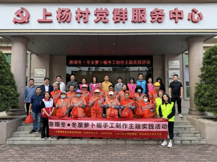 12月19日,在大亞灣西區(qū)街道上楊村黨總支的大力支持下,西區(qū)第五片區(qū)社工點(diǎn)聯(lián)合上楊村婦聯(lián)、新時代文明實(shí)踐站共同開展“惠暖冬,冬至蘿卜粄手工制作”主題實(shí)踐活動,以傳統(tǒng)美食為紐帶,為村居環(huán)衛(wèi)工人、孤寡老人、殘疾人等群眾送上節(jié)日關(guān)懷。