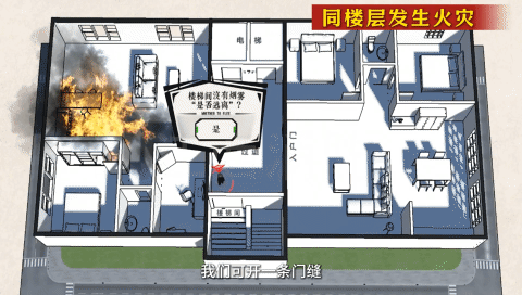 如果開門走廊里沒有煙,但是樓梯間里有煙,仍然要退回室內關門等待救援;