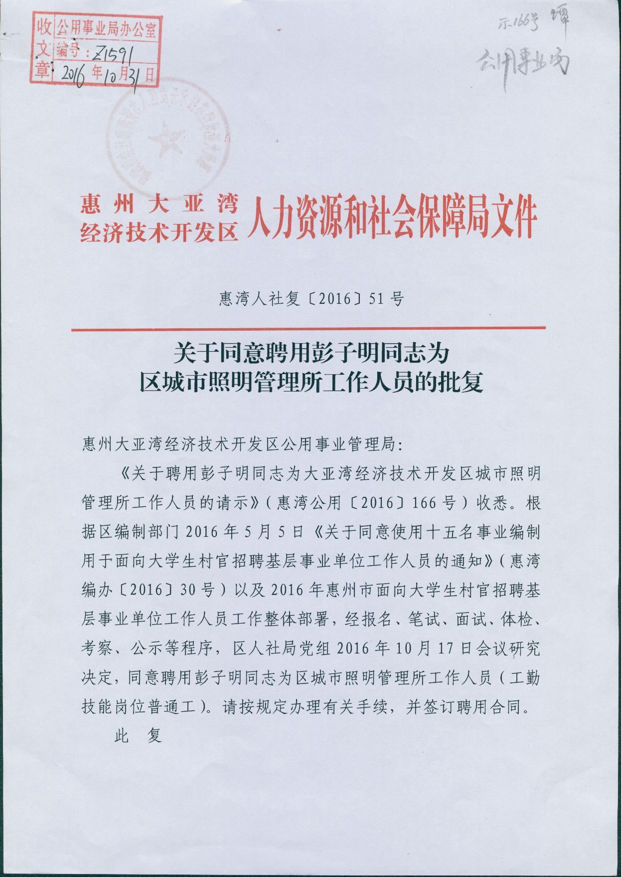 關于同意聘用彭子明同志為區城市照明管理所工作人員的批復