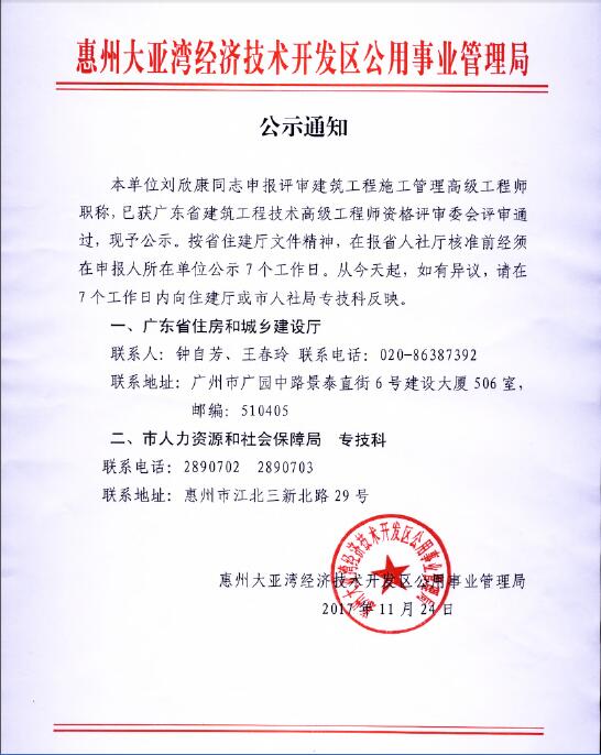 公示通知(劉欣康同志評審建筑施工管理高級工程師)